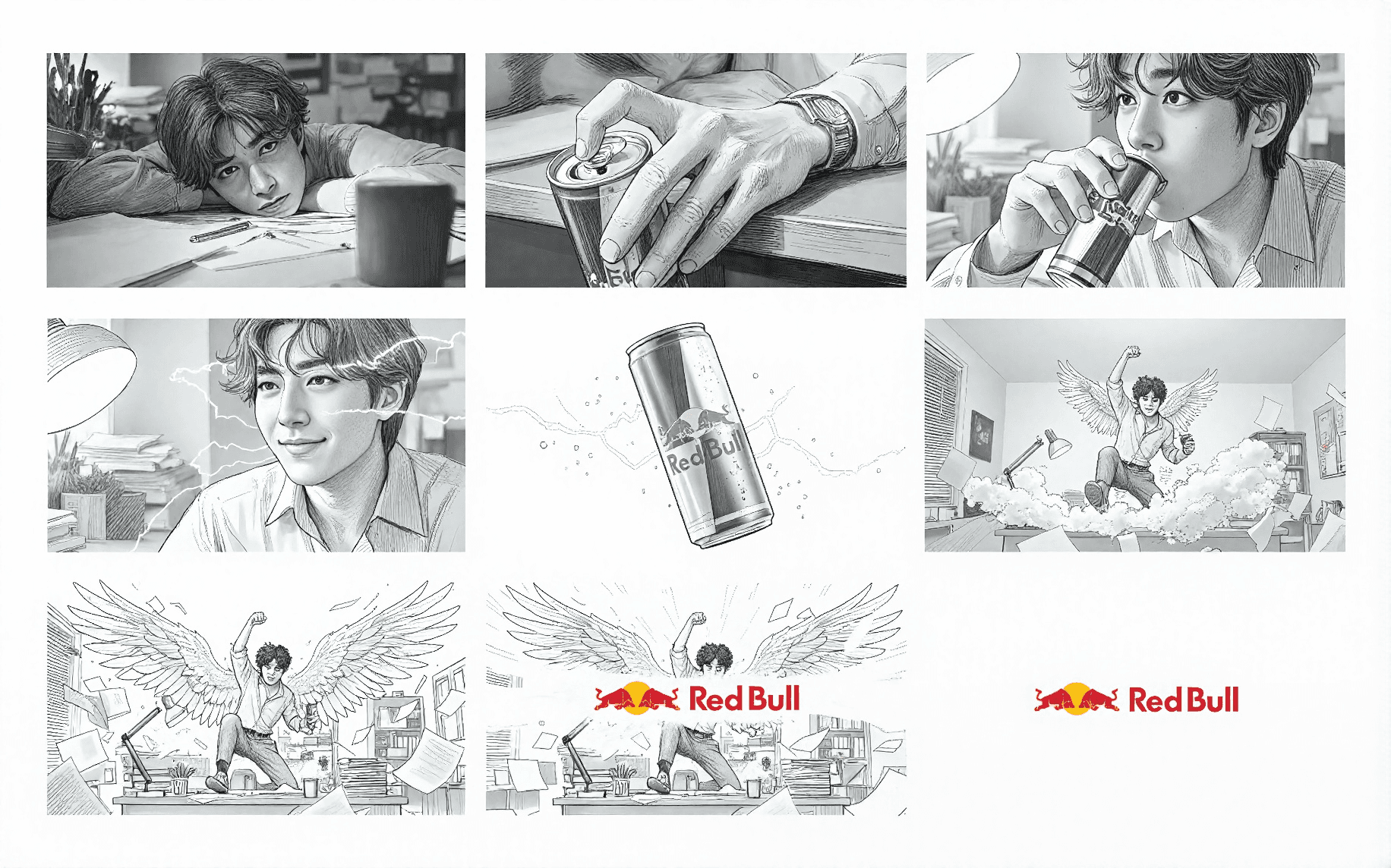 I started by designing a East Asian as the main character—piercing eyes under tousled hair, relatable midnight grind vibe—to bring resonance to the global Red Bull archetype. The cluttered desk room came first as a Midjourney reference image, locking consistent lighting, silver can placement, and chaotic papers for frame-perfect continuity across all keyframes.