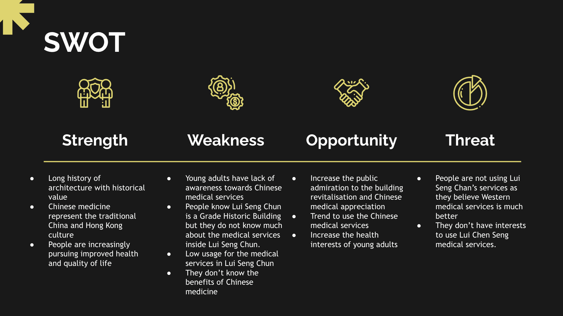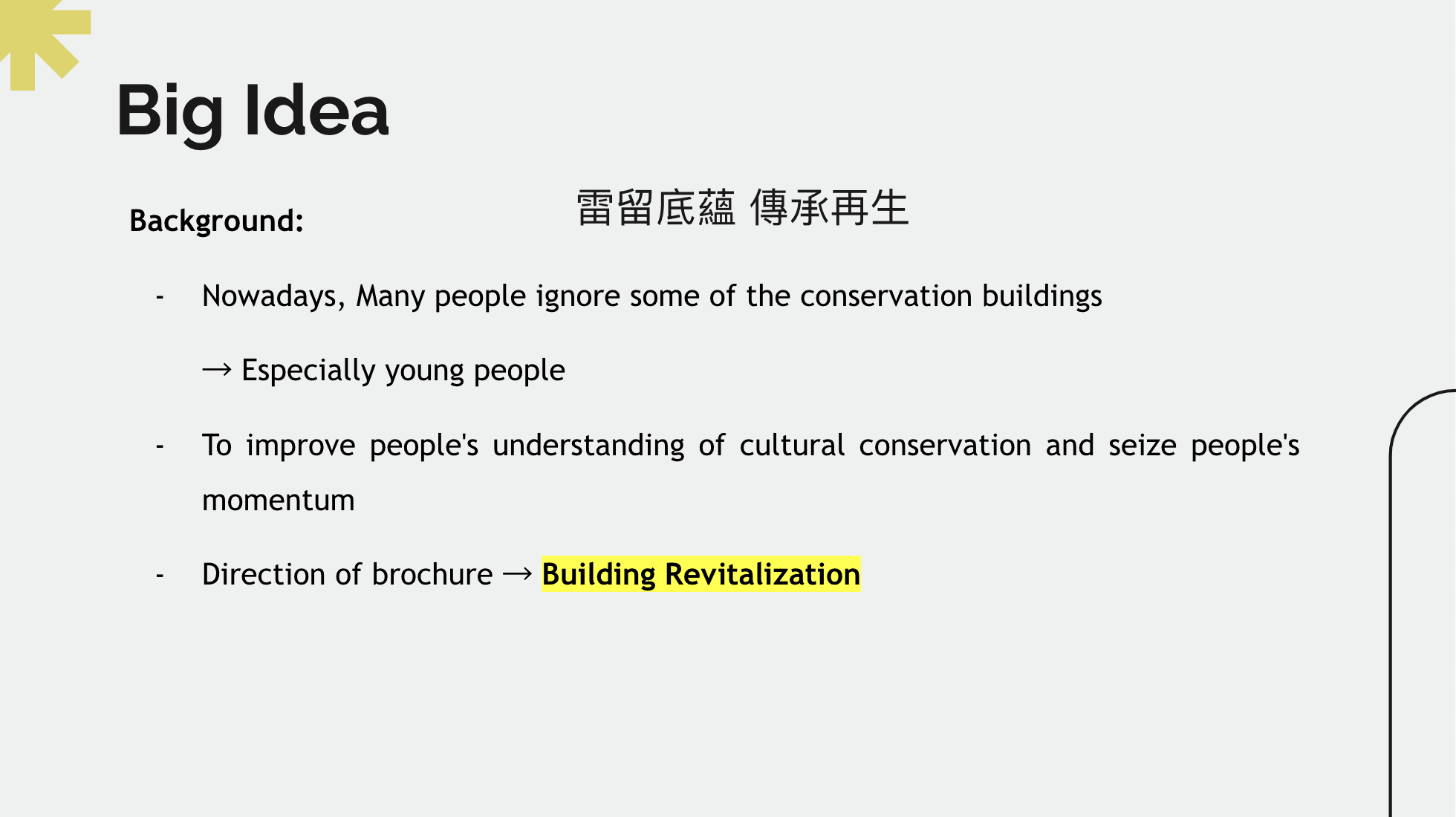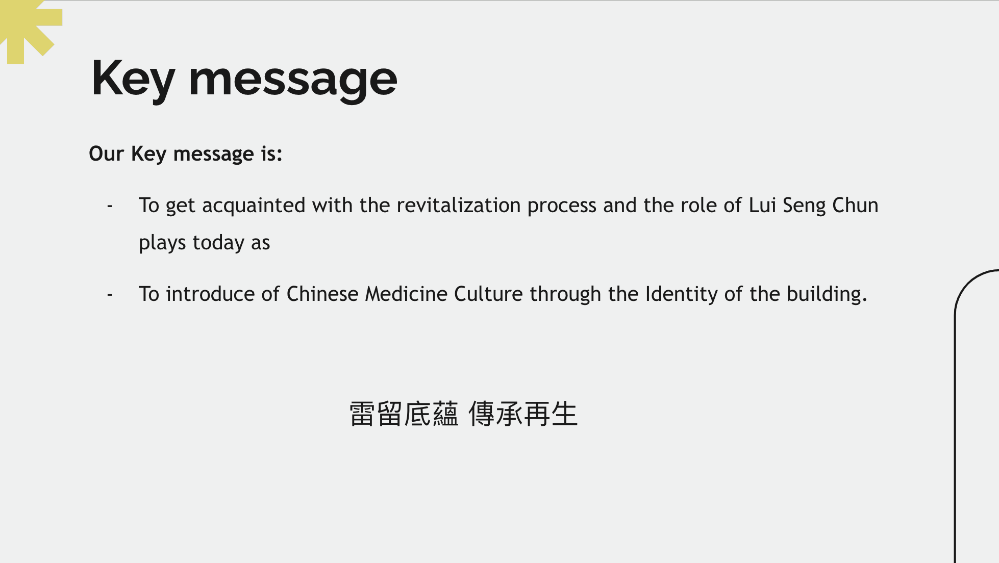 The Lui Seng Chun building is a Grade I historic building in Hong Kong that has been standing for over 90 years. To promote cultural conservation and revitalization, a brochure has been designed to introduce the history and significance of the building. The target audience for the brochure is young adults aged 20-30 who are interested in physical and mental health and Chinese medicine culture. The brochure aims to acquaint people with the revitalization process and the role of Lui Seng Chun today, and to introduce Chinese medicine culture through the identity of the building. The brochure has several objectives, including promoting awareness of Lui Seng Chun's historical significance, raising people's historical awareness of cultural conservation, and encouraging people to use the TCM services provided by Lui Seng Chun. By achieving these objectives, the brochure hopes to contribute to the preservation of Hong Kong's cultural heritage.