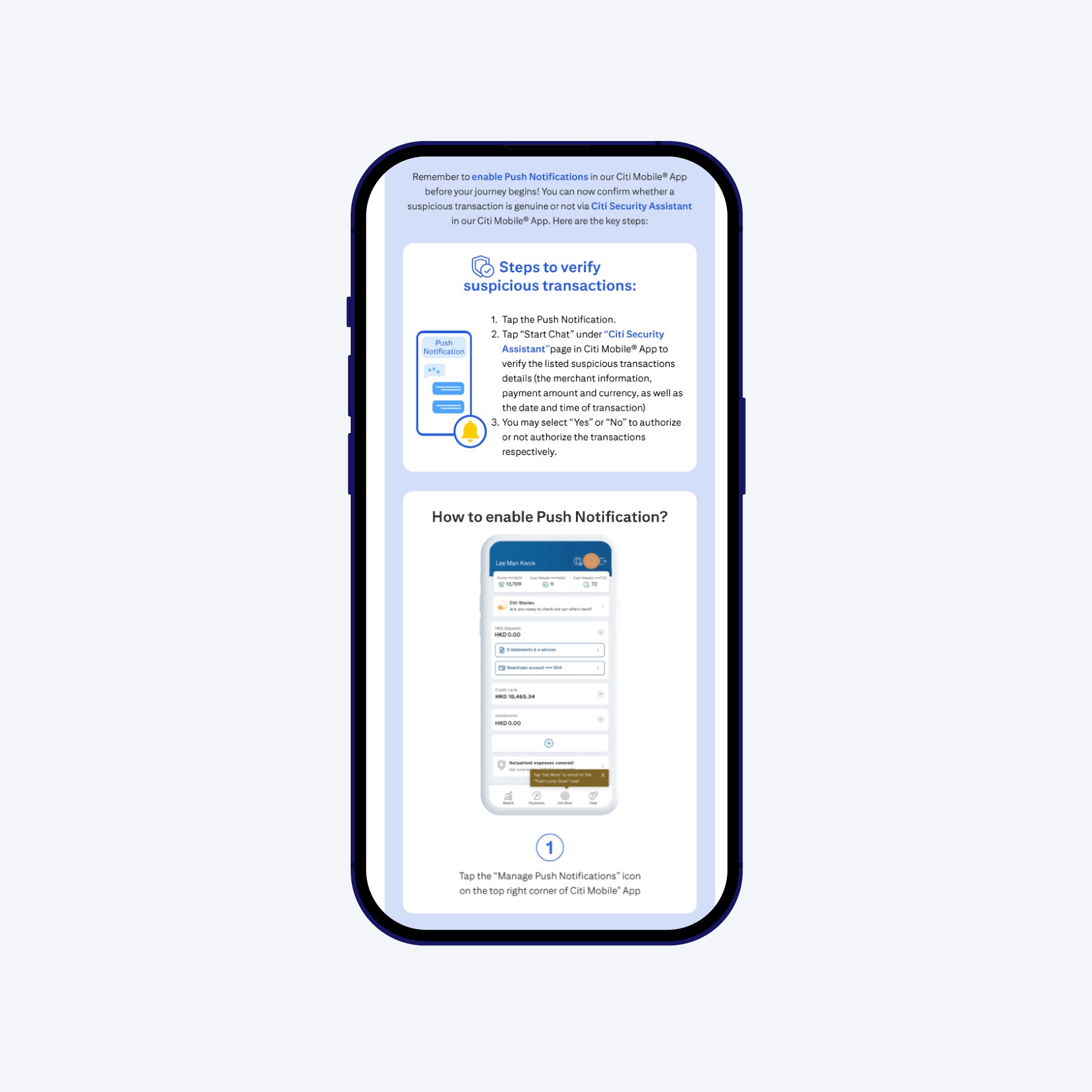 The eDM aims to educate customers about the importance of staying vigilant, reporting lost or stolen cards, and safeguarding their digital keys. It highlights proactive measures such as alerting customers of suspicious transactions through 2-Way SMS and Push Notifications, as well as providing instructions on verifying transaction authenticity and reporting incidents promptly. Additionally, the eDM emphasizes the significance of regularly changing passwords and being cautious with sharing personal and banking information. To enhance the eDM's visual appeal and engagement, eye-catching graphics and icons are incorporated. The overall objective is to educate and empower customers to travel smart, stay safe, and protect their financial well-being while maintaining a professional and concise tone.