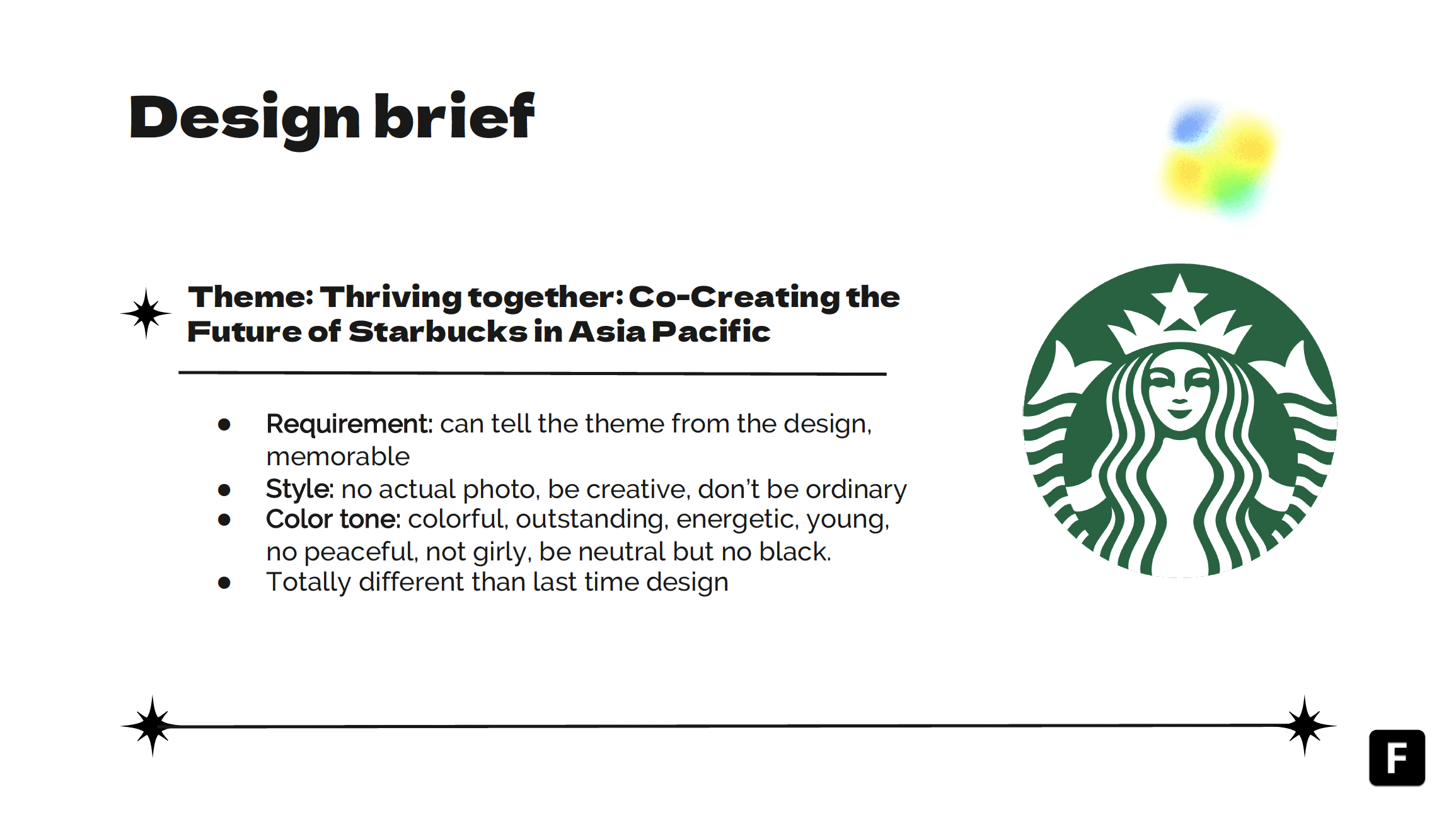 For this year's spring-summer themed Starbucks design project, the aim is to create a unique and memorable design that embodies the theme of "Thriving Together: Co-Creating the Future of Starbucks in Asia Pacific." Rather than relying on traditional visuals such as coffee trees or the siren holding a cup, a more abstract approach will be taken.