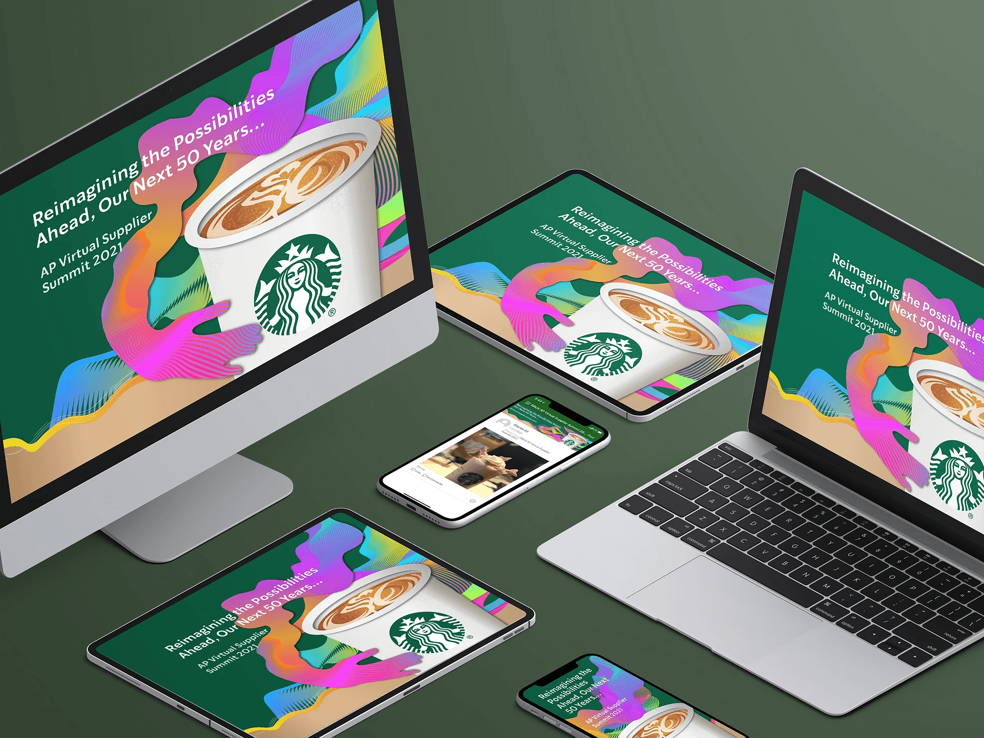 Starbucks has selected "Reimagining the possibility ahead, our next 50 years..." as the theme for their 50th anniversary celebration, which focuses on the brand's future potential. To commemorate this special occasion, Starbucks is launching a mobile app, along with a set of digital posters and banners. The objective is to create a design that is both memorable and creative while avoiding the ordinary.